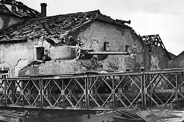 Another tank commander, Staff Sgt. Ruben Rivers, encountered a German roadblock that forced his tank to a halt. Under heavy enemy small arms fire, he leaped out of the tank, attached a cable from his Sherman to the roadblock, remounted, and then had his tank pull the obstacle off the road, freeing the tank column to resume the advance and capture the town. Rivers would later receive the Silver Star for his conduct. Like King, however, Rivers would be killed in action several days later; his medal was sent to his family in Oklahoma posthumously.